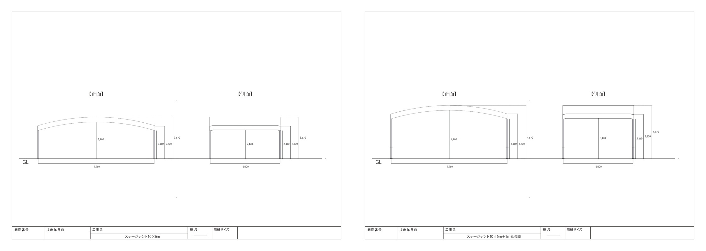 | 詳細 | サイズ:W10000×D6000×H2410~2800mm P.1_ステージテント10×6mノーマル図面 P.2_1m延長脚図面 |